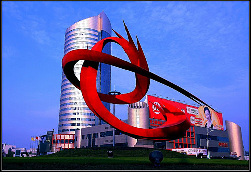 腾飞——该雕塑位于新区狮山大桥西十字交叉口,给人印象即是环抱形状,意味着团结,也是高科技的象征物。但笔者更认为是呈一种飞腾势态,红色象征着热情奔放。该雕塑很明显的告诉市民新区将是一块继工业园区后改革开放的又一块沃土。(器材:佳能30D 17~35MM F/2.8~4适马镜头)