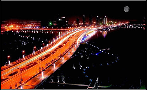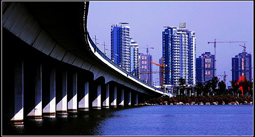 景观大桥——继夜景之后拍摄了一幅白天的大桥,拍摄地点在大桥下,构图以高大的桥引成一道曲线在上空展开,以示伸向更远,更有规模的大桥雄姿。阳光斜照在桥墩下形成一个高光图案,把桥的基础显示得更扎实。远处正在建设中的建筑是陪衬同时把湖东的发展明确的告诉着别人。(器材:佳能300D 28~105MM F/3.5~4.5镜头)