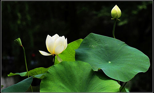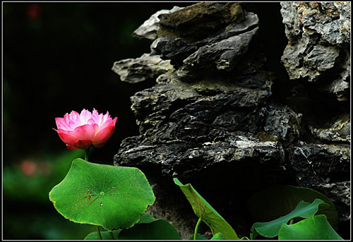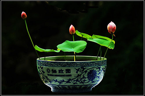 ——题名取自于贺铸[1052-1125,浙江绍兴人]词句,表示贺铸不肯阿谀权贵的写照-----“当年不肯嫁东风”。最后莲之“无端却被秋风误”,与贺之不为世所容,郁郁终生也是吻合的。贺晚年居住苏州,把荷花以艺术形式拟人化处理填下了不朽的词篇《踏莎行》,本片集3张/孤傲,三姐妹,冷艳的美,均以贺的品格为基础构思。“孤傲”以与石为伍,独放一朵表示。“三姐妹”以豆蔻年华的少女形象表示了荷的清高与美,又以古城苏州拙政园特有的盆栽一品荷象征文化内涵,以示贺晚年居住苏州相呼应的历史名城的传承。(器材:佳能30D 100~300MM F/4 图丽镜头)