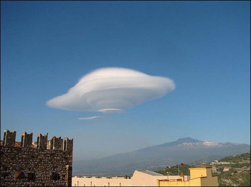 这是摄影师在山区拍摄到的云朵景观,晴朗的天空中出现了类似于不明飞行物(UFO)的云朵,远处看这个巨大的“UFO”云朵好像正在旋转着向地面降落。