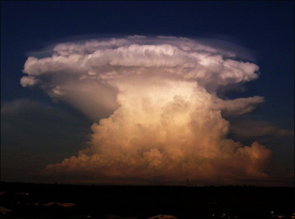 这个傍晚拍摄的云朵照片似乎很容易让人联想起核爆炸形成的“蘑菇云”景观。不过请不用担心,这个云朵里有的只是水蒸气和空气尘埃,并没有“蘑菇云”里散发出的放射性物质。