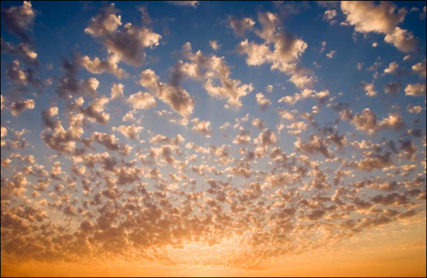 宁静的黄昏时期,太阳把部分天空照成了桔黄色,高空中风已经把云层吹散开。从地面观看,天空中的云朵像飘散的棉絮。