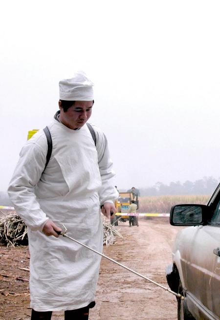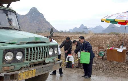 1月29日,发生禽流感的广西南宁市隆安县丁当镇,工作人员正在路口为过往车辆消毒。