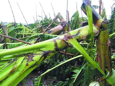 昨天下午,记者冒雨来到了强台风“科罗旺”的登陆点之一——徐闻县沿海的前山镇,在赶往灾情最重的前山镇曹家村时看到,往日平静的场景已被狂风暴雨撕裂得支离破碎:公路两旁或林地里的树木被拦腰折断,甘蔗、香蕉等农作物成片倒伏,公路上电线杆成行倒下,海边多处海堤决口,连片虾塘淹没,村子里的不少房屋已严重受毁或倒塌;随后,记者在徐闻县竹山村委会里看到,一棵两人手拉手也无法合抱过来的百多年树龄的老榕树,也难逃厄运——被连根拔起,把一村民新建的楼房压毁了,可幸当时屋内无人。