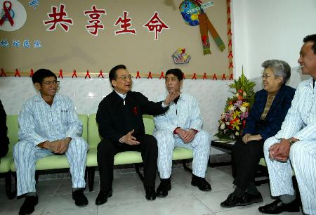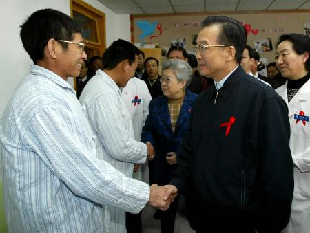 新华网北京12月1日电 (记者 秦杰) 12月1日是“世界艾滋病日”。中共中央政治局常委、国务院总理温家宝上午来到北京市地坛医院,看望正在这里住院治疗的艾滋病患者,代表党中央、国务院向辛勤工作的医护人员,向所有为艾滋病防治工作作出贡献的卫生工作者和社会各界人士表示衷心的感谢,向全国的艾滋病病毒感染者和患者表示亲切的慰问。