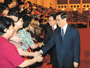 开幕式前,胡锦涛、吴邦国、温家宝、贾庆林、曾庆红、黄菊、吴官正、李长春、罗干等党和国家领导人在人民大会堂二楼宴会厅会见了出席中国妇女第九次全国代表大会的全体代表,并与大家合影留念。