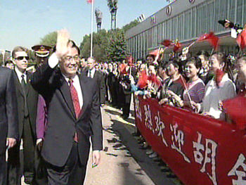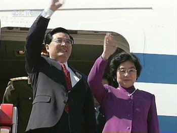 胡锦涛主席和夫人刘永清面带微笑走出飞机舱门。