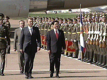 莫斯科今天天气非常晴朗。胡锦涛和夫人刘永清及代表团一行乘坐的专机,于当地时间下午四点左右平稳降落在莫斯科伏努科沃机场。虽然刚刚经过了六千多公里的长途飞行,身着深色西装的胡锦涛出现在机舱门口时,依然如往常一样神情轻松,面带微笑。