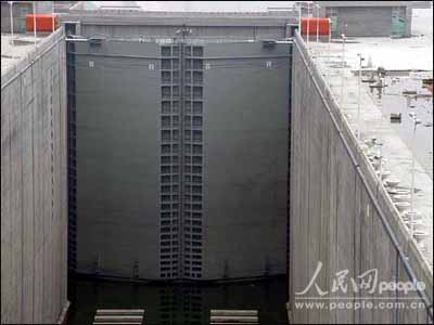 紧闭的闸门。五级船闸共有12道闸首24扇钢铁巨门,每扇门高38.5米、宽40.4米,重达1700吨,相当于4个蓝球场大。闸门呈“人”字状开启,渗水率低于每秒0.03立方米。