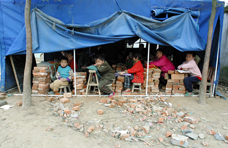 “天晴还好,”崔寨小学的竹庆中老师说,“一下雨,棚子就会漏水,地上都是泥巴。而且天气也越来越冷了,就怕孩子们会冻着。”最新的消息是:镇里已经准备在庄台上建新的校舍,现在正在选址。“但愿能在冬天之前搬进新教室里。”竹老师说。