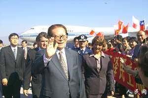 江泽民主席乘坐的专机在飞行约23个小时之后,于当地时间今天上午10时10分平稳降落在圣地亚哥国际机场。机场停机坪上铺着红地毯,欢迎的人群挥动着中智两国国旗。江泽民主席和夫人王冶坪在智利外交部礼宾官和中国驻智利大使任景玉的陪同下,步下舷梯。智利外交部长索莱达以及圣地亚哥卫戍区空军司令、智利驻华大使塔鲁德在舷梯旁迎接。他们陪同江主席来到红地毯前,军乐队奏响中智两国国歌。随后,在智外交部长索莱达和卫戍区空军司令陪同下,江主席检阅了智利仪仗队。接着,江主席与前来迎接的智方其他官员一一握手,中国驻智利使馆人员向江主席和夫人献上鲜花,江主席向前来欢迎的使领馆人员及华侨和留学生代表挥手致意。
