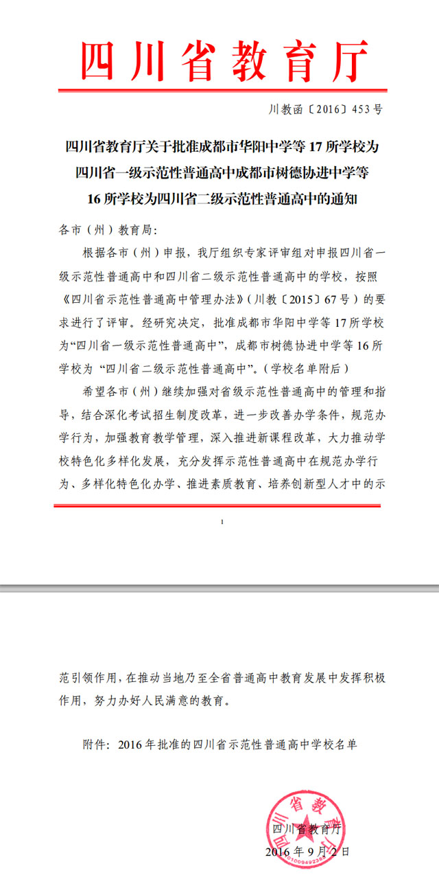 9月2日,四川省教育厅下发文件,四川双流棠湖中学外语实验学校获评四川省一级示范性普通高中!全省17所学校晋升省一级示范学校,其中成都7所(两所民办学校:棠外和成都七中嘉祥外国语学校)。十三载筚路蓝缕,这是在黄光成校长的带领下,经过全校教职工共同努力的结果!这是对棠外先进的教育理念、鲜明的办学特色以及丰硕的教育成果的肯定!感谢各级领导、学生家长以及社会各界人士对我校的亲切关怀与大力支持!