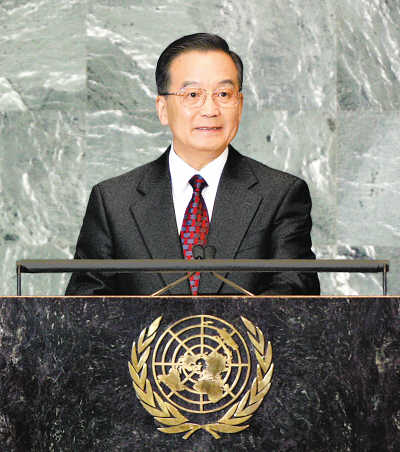 九月二十四日,国务院总理温家宝在纽约举行的第六十三届联合国大会一般性辩论中作题为《坚持改革开放 坚持和平发展》的发言。