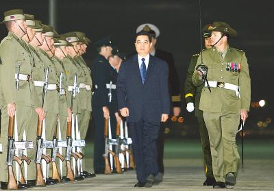 胡锦涛是在结束对西澳州访问后于当天下午乘专机抵达堪培拉的。澳大利亚总督杰弗里、参议长弗格森、众议长霍克等各界人士到机场迎接。杰弗里在机场举行隆重仪式,热烈欢迎胡锦涛对澳大利亚进行国事访问。