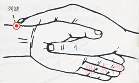 列缺是肺经中的一个穴位,功效就是止咳,所以单纯性的咳嗽,没有其他症状时,只按列缺就可以缓解咳嗽。怎么找这个穴位呢?将两手虎口交叉,手腕要伸直,将食指点在手腕的侧面,可以感觉到食指下面的骨头上有一个明显的纵向裂隙,这里就是列缺穴。因列缺穴位于窄小的骨缝中,所以治疗时需将拇指立起用指尖掐按。每次3~5分钟,每日5~10次。