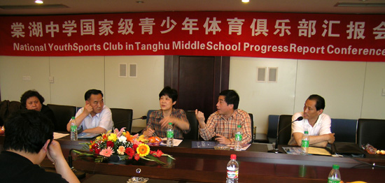 棠湖中学副校长熊伟、双流县教育局局长高志文、双流县县委副书记曾敏、成都市体育局局长覃文林、四川省体育局党组书记杨云章分别就各自相关的工作向国家体育总局的领导作了汇报。田文惠司长现场就俱乐部的活动形式及“断奶后”的经费、出路两个重要问题与参会人员进行广泛的讨论和调研。