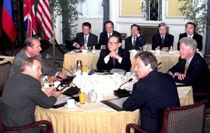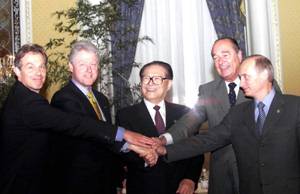 9月7日,由中国倡议的联合国安理会五个常任理事国首脑会议在纽约举行。这是自联合国成立以来第一次举行安理会常任理事国首脑会议。正在出席联合国千年首脑会议的中国国家主席江泽民(中)、法国总统希拉克(右二)