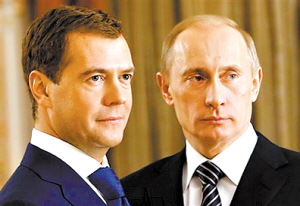 俄当选的总统梅德韦杰夫(左)与现任总统普京在一起。