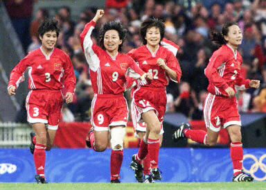9月17日,中国女足在墨尔本板球场举行的奥运会女子足球比赛中,以1:1战平美国队。这是孙雯在第67分钟时利用定位球的机会,直接射门得分后,和队友一起庆贺。