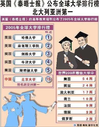 英国《泰晤士报》的高等教育增刊27日公布了2005年全球大学排行榜,美国哈佛大学名列第一,中国的北京大学名列全球第15位,超过日本的东京大学而名列亚洲第一。
