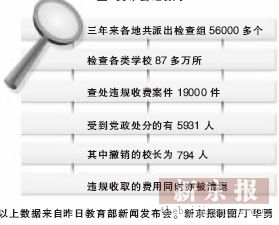 教育部监察局局长刘金平通报了2003年以来教育系统治理教育乱收费的情况,共查处违规收费案件19000多件,5931人受到党政纪处分。田淑兰告诉记者,2003年以来全国共治理教育乱收费17亿元,基本上遏制了教育乱收费蔓延的势头。