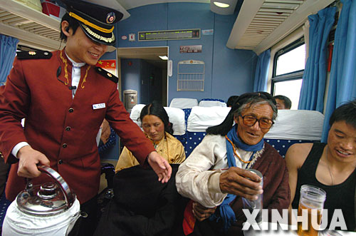 在西宁至拉萨N917次列车上,列车员为前往拉萨朝拜的青海省玉树藏族自治州藏族老人达瓦才仁送水(11月21日摄)。