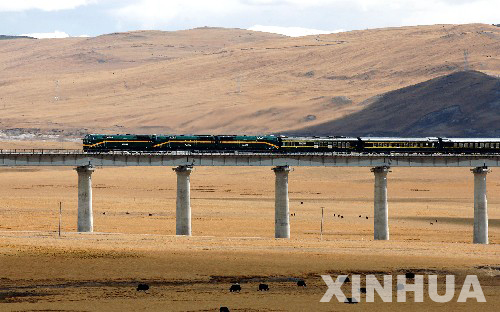 一辆青藏铁路列车行驶在藏北那曲特大桥上(10月13日摄)。