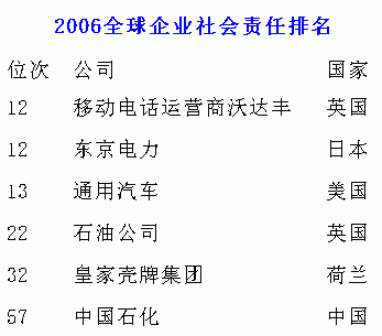 能够入围美国《财富》杂志评选的“世界500强”企业榜单,一直是令全球众多顶级企业感到荣耀的事情。而该杂志本月最新公布的“2006企业社会责任评估”排名,则是对这些世界级的财富领先企业在管理和承担社会责任方面表现的一次综合考量。