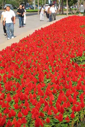 9月29日,行人从摆放着鲜花的山东青岛市香港中路经过。日前,数十万盆鲜花装点青岛街头,以迎接国庆佳节的到来。
