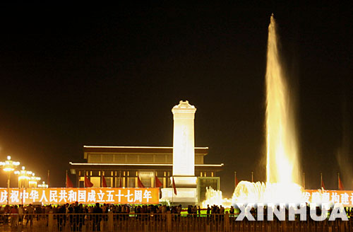 北京天安门广场庆祝国庆节的喷泉和新景观已全部布置完成,广场夜景格外美丽。