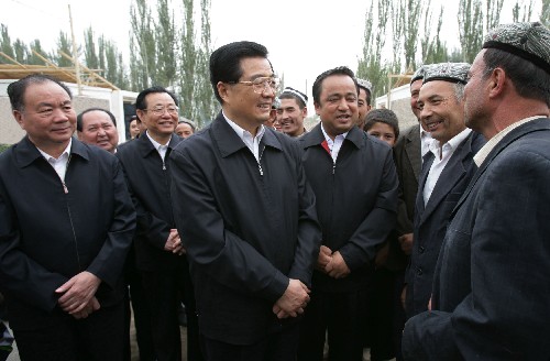 9月6日至11日,中共中央总书记、国家主席、中央军委主席胡锦涛在新疆考察工作。这是9月8日胡锦涛在洛浦县山普鲁乡加依艾日克村同村民们亲切交谈。