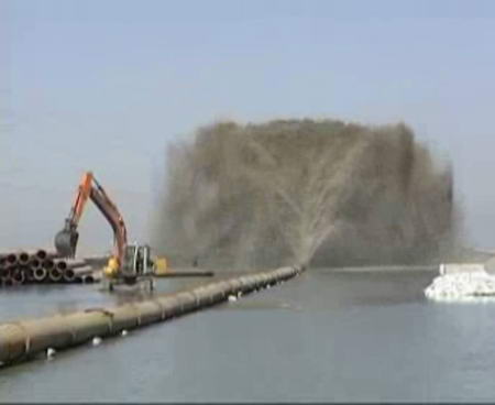 薛渤珣:“这个浅滩有大量的泥沙,曹妃甸造地应该在原来的海平面上把它抬高四点五米。那么这样大量的泥沙就靠那种搅吸船,它把海水和泥沙同时搅起来,然后用一种泵顺着这个管道,吹到你需要造地的地方。到造地的地方我们看到沙子迅速的沉淀。然后海水就顺着原来的渠道,就又回到海里边去了。”