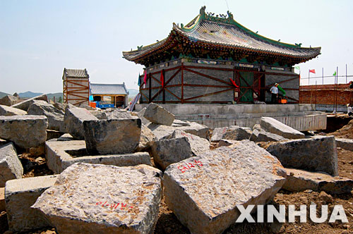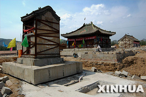这是5月14日拍摄的迁移到位的慈源寺大雄宝殿。 当日,河南省安阳市林州慈源寺3座主要建筑整体搬迁工程成功完成,创下了距离最长、转弯次数最多等古建平移国内纪录。慈源寺始建于唐代贞观年间,是我国罕见的一处融儒、道、佛三教于一体的历史文化遗存。2004年,安阳至林州高速公路开工建设,因寺院南北地下均为煤矿采空区,拟建的高速公路只能从寺院中部通过。为了保护这一优秀文化遗产,河南省政府同意慈源寺整体迁移保护。