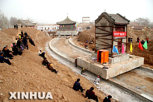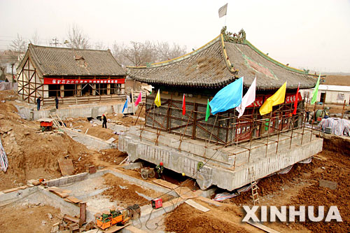 3月14日,林州千年古寺慈源寺的文昌阁在搬迁过程中缓缓前移。