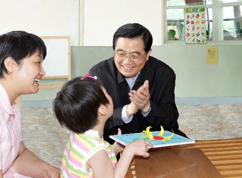 为了促进残疾儿童性格发展和身体机能恢复,福利院综合楼三层设有引导式教育训练室。胡锦涛来到这里,看望正在进行训练的孩子。3岁的昌建辉小朋友正在利用双杠做下肢复合训练,胡锦涛走过去,小心翼翼地扶着他连续走了几个来回。患脑瘫的8岁儿童楠楠经过一段时间的训练,已经能简单会话和独立行走。她拿着一幅剪纸贴花,走到胡锦涛跟前说:“胡爷爷,这是我亲手做的,送给您。”胡锦涛高兴地接到手里,并坐在小板凳上同她交谈。“知道明天是什么日子吗?”胡锦涛问。“知道,明天是‘六一’儿童节。”听到楠楠吐字清楚的回答,胡锦涛开心地笑了。他搂着小楠楠,动情地对大家说,少年儿童是祖国的未来、民族的希望。全党、全社会都要关心孩子们的健康成长。孤残儿童是社会上最弱小、最困难的群体,他们最需要呵护、最需要关爱。各级党委和政府都要把孤残儿童放在心上,健全救助制度,完善福利设施,推进特殊教育,动员社会力量为孤残儿童奉献爱心,使他们和其他小朋友一样,在祖国的同一片蓝天下健康幸福成长。总书记的一席话,使在场的人们深受感动和鼓舞。