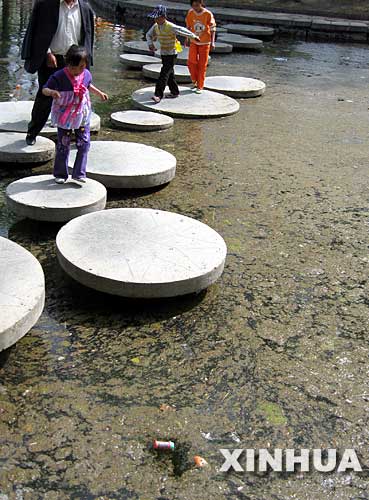 青海省西宁市儿童公园的水塘污浊不堪(5月5日摄)。“五一”长假接近尾声,商家自然要盘点经济账,此时,每一个人也应检讨一下自己,节日期间在践行社会主义荣辱观方面,自己是得分了,还是失分了。