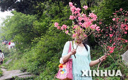 在鄂东麻城市龟山景区,游人手执花枝走在山路上(5月2日摄)。