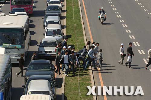 一些游客在沈阳一处旅游景区旁穿越公路(5月1日摄)。