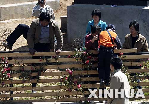 一些游客在沈阳一处旅游景点内攀爬栏杆(5月1日摄)。