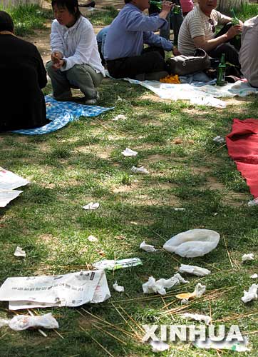 青海省西宁市人民公园的草地上到处都是游客丢弃的垃圾(5月5日摄)。