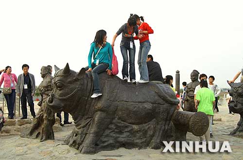 游客在山西永济黄河大铁牛景区内随意踩踏大铁牛(4月27日摄)。