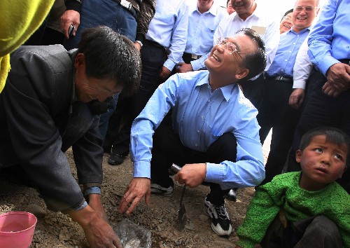 5月6日,中共中央政治局常委、国务院总理温家宝来到宁夏中宁县喊叫水乡农民田丰朋(左一)的地里,了解他在旱地里栽种西瓜苗的情况。当得知他饮水、衣食都有保障,并且有信心战胜旱灾时,总理会心地笑了。 宁夏中部地区遭受历史上罕见的旱灾,连续600多天没有有效降雨。中共中央政治局常委、国务院总理温家宝非常关心受灾地区群众的生产生活。5月6日至7日,他先后到中宁县、同心县察看旱情,同当地干部群众研究抗旱救灾工作的措施。