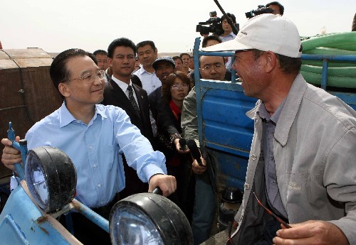 5月6日,中共中央政治局常委、国务院总理温家宝在宁夏中宁县察看旱情时,向开拖拉机运水的农民杨兴祥询问有关抗旱的情况。 宁夏中部地区遭受历史上罕见的旱灾,连续600多天没有有效降雨。中共中央政治局常委、国务院总理温家宝非常关心受灾地区群众的生产生活。5月6日至7日,他先后到中宁县、同心县察看旱情,同当地干部群众研究抗旱救灾工作的措施。