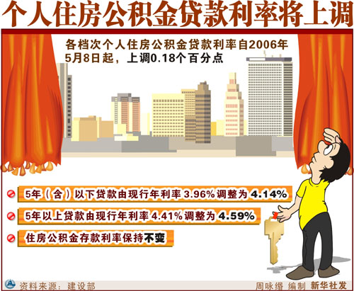 新华社北京4月28日电(记者 王永康) 建设部28日宣布,根据《中国人民银行关于调整金融机构人民币贷款利率的通知》,从2006年5月8日起将各档次个人住房公积金贷款利率上调0.18个百分点。
