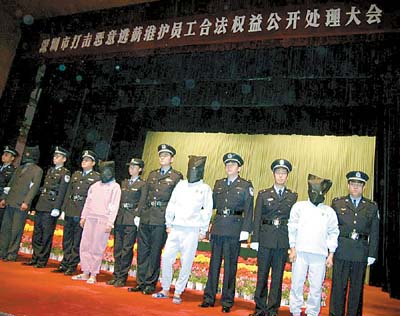 昨日,深圳市公安局经济侦查分局将拖欠员工工资的老板何某等8人押入深圳会堂并公开宣布刑事拘留决定。