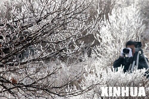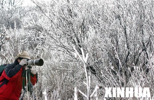 4月2日,一名摄影爱好者在河北省秦皇岛市的祖山风景区拍摄冰挂景观。
