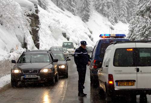 在法国的圣莫理斯堡,通往多个滑雪场的道路因有雪崩的危险而封闭,宪兵要在路上把这个坏消息通知驾车人士。
