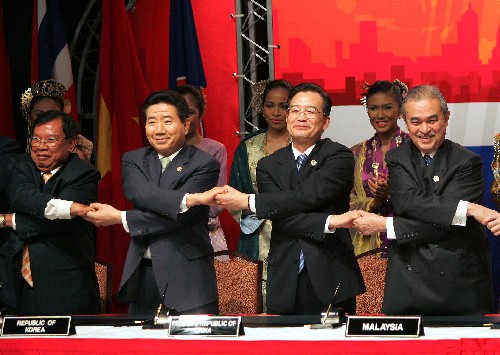 12月12日,第九次东盟与中日韩领导人(10+3)会议在吉隆坡会议中心举行。东盟10国和中日韩三国领导人出席会议,共商东亚合作发展大计。会后,各国领导人签署了关于东盟与中日韩领导人会议的《吉隆坡宣言》。这是宣言签署后,各国领导人手拉手。