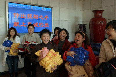 全国总工会、共青团中央、全国妇联、中国作协等单位的捐助点前也非同寻常。在单位领导的带动下,广大党员踊跃捐助,出差、休病假的同志也委托他人送来捐款和衣物。寒风中,工作人员对捐助的钱物认真登记,对捐助物品逐一清点、分类,经过仔细消毒后打包、装车。