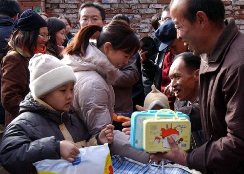12月11日,在河北省平山县北冶乡恶石村,一个孩子(前左)正在捐献学习用品。当日,河北省石家庄市“送温暖、献爱心大型社会帮扶行动”在太行山区的平山县北冶乡举行。来自石家庄市的200多个家庭的430多人为老区贫困群众送来了衣物、被褥等捐赠物品。